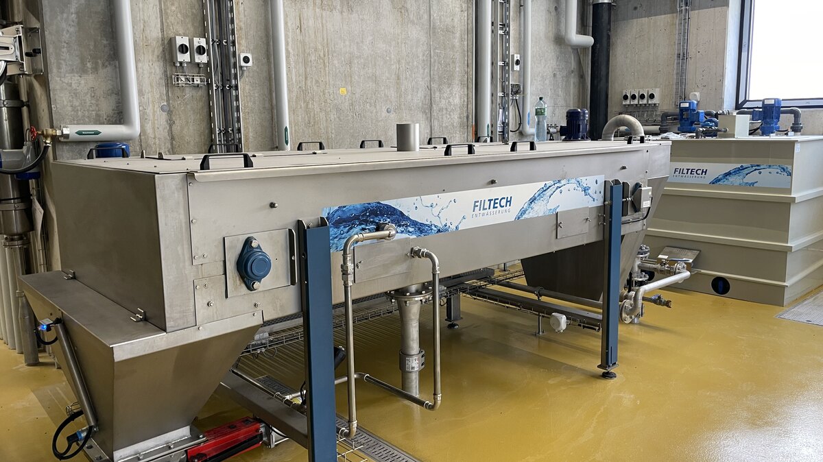 Ein kleiner Teil des aus der biologischen Reinigungsanlage entfernten Schlammes wird als Überschussschlamm der Schlamm-behandlung zugeführt. Der Wasseranteil dieses Schlammes ist jedoch sehr hoch und würde das Schlammvolumen unnötig erhöhen. Durch gleichmässiges Auftragen des Schlammes auf ein rundum laufendes Filterband wird dem Schlamm der grösste Teil des Wassers entzogen. Dieses tropft in die Wanne unter dem Aggregat, von wo es wieder in die Abwasserreinigung zurückfliesst. Der vorentwässerte Schlamm wird mit einer Pumpe in einen geschlossenen Behälter gefördert, wo er dem Frischschlamm zugemischt wird. Anschliessend wird der Mischschlamm in die Faulung gefördert.