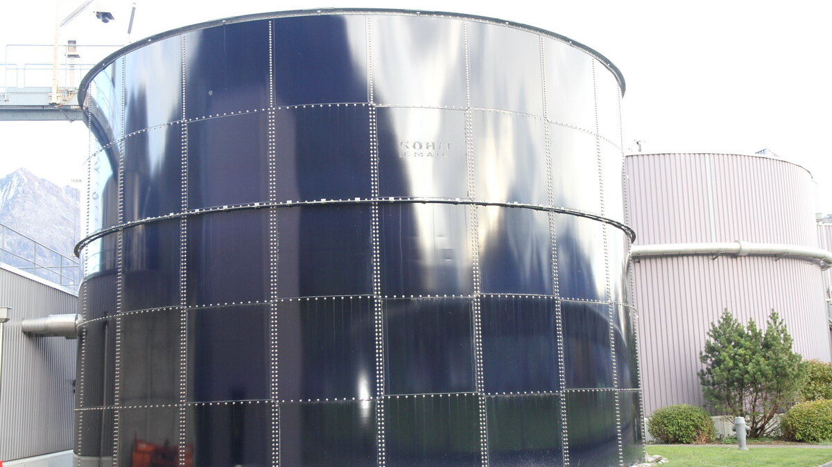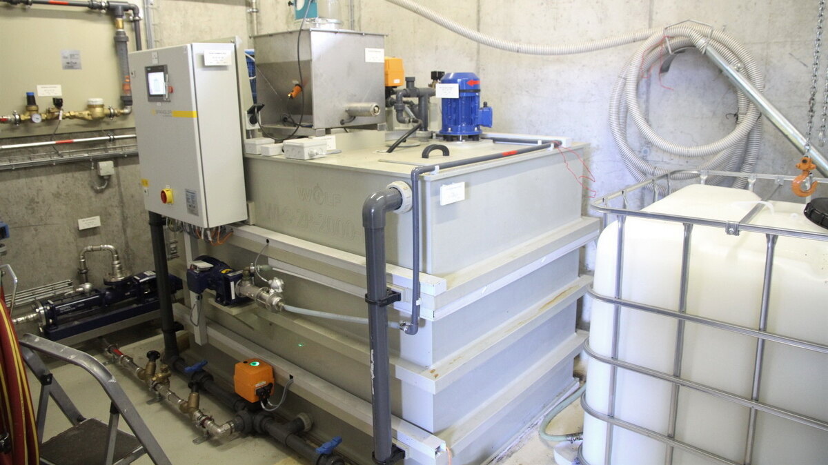 Dieses Faulwasser wird regelmässig in einen zwischen den beiden Stahltanks liegenden Faulwasserschacht abgelassen und zwischen-gespeichert. Da dieses Faulwasser sehr nährstoffreich ist, wird es dosiert und während der Schwachlastzeit, vor allem in der Nacht dem biologischen Reinigungsprozess zugeführt. Der eingedickte Klärschlamm wird mit einem Rührwerk homogenisiert und der Entwässerungsanlage zugeführt.